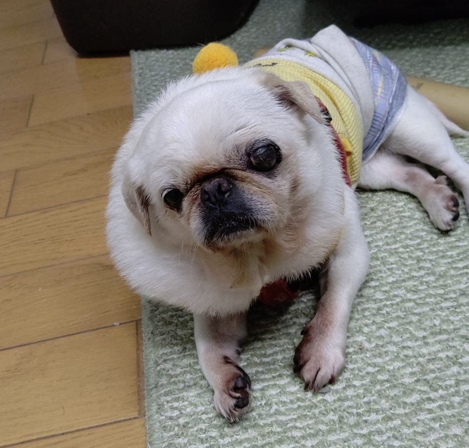 名前はミルク。白パグの高齢犬(♂)です。